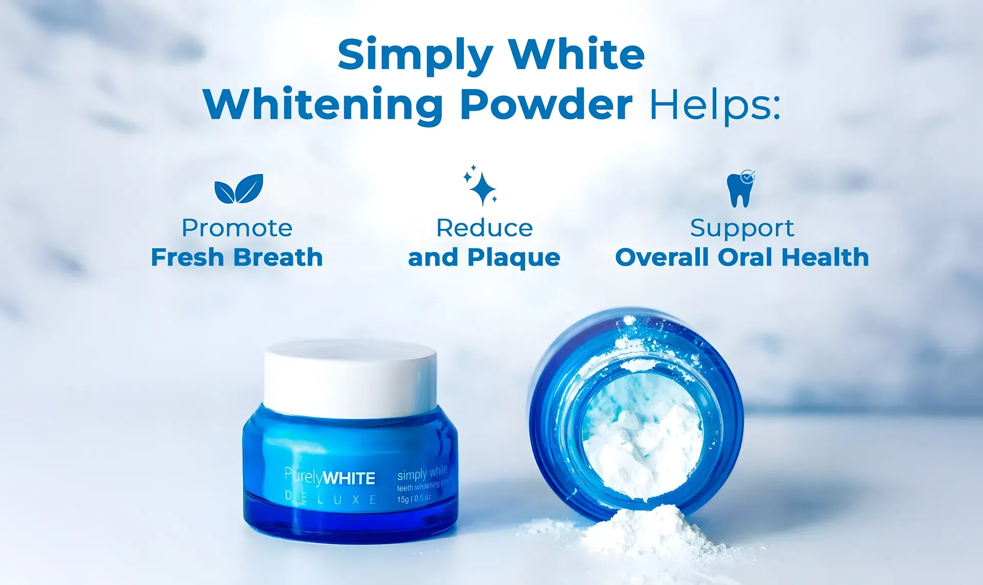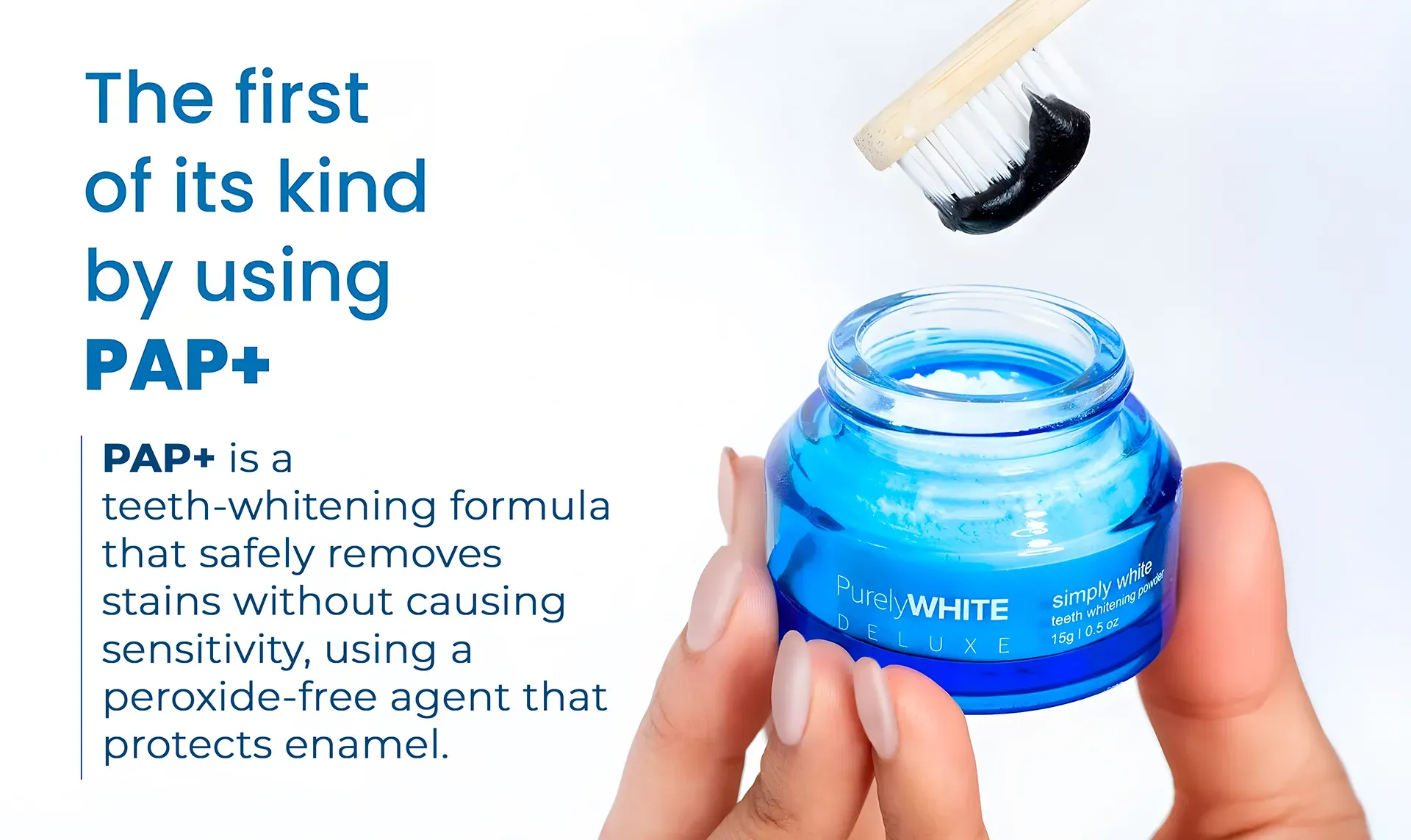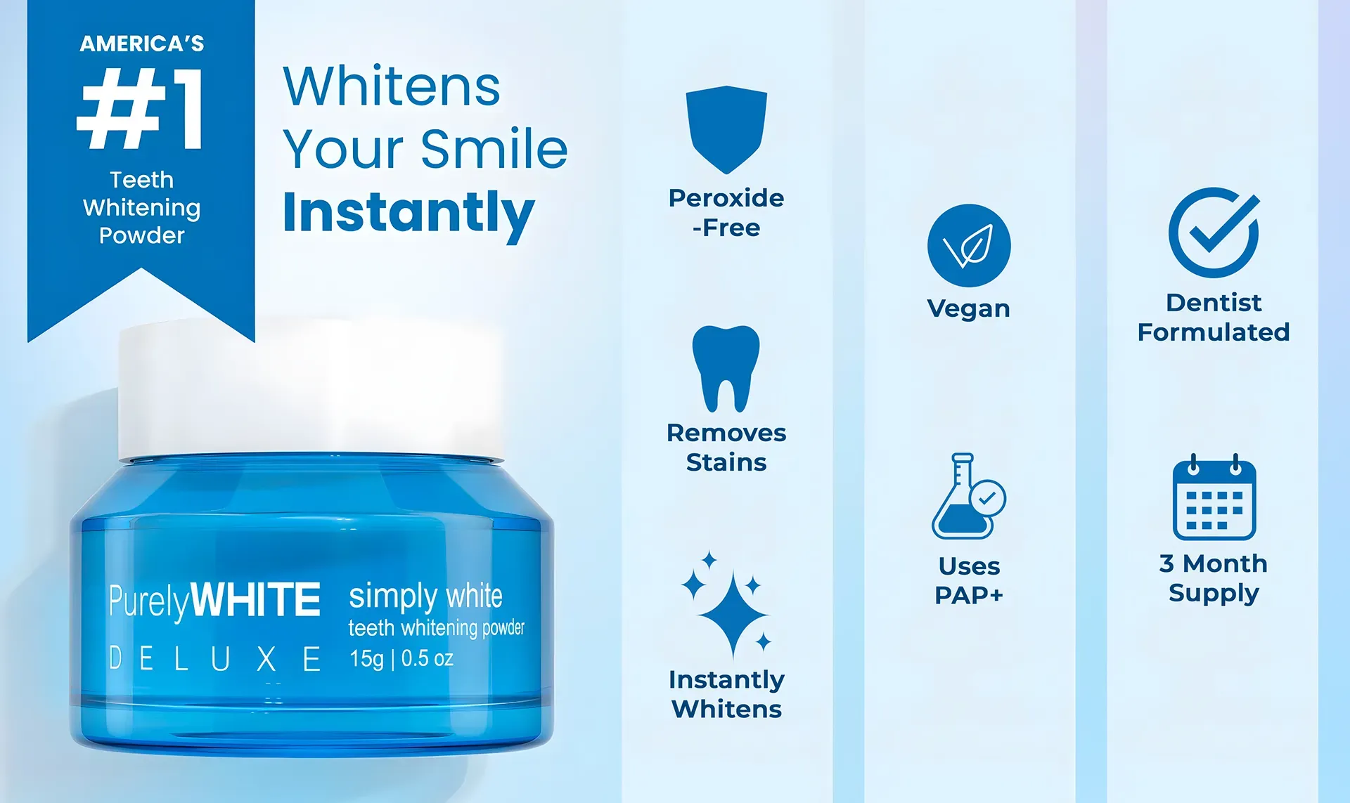 PurelyWHITE is a 3-in-1 teeth whitening powder designed to be used as part of your normal brushing routine.